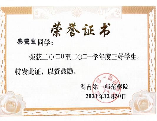 蔡雯萱,中共党员,2020级思想政治教育1班班长。综测成绩连续四年位列专业第一;湖南省优秀毕业生、新华联奖助学金获得者,在校期间获得国家励志奖学金、一等奖学金等校级以上荣誉共计45项;积极参加创新创业,所参与项目被湖南教育电视台、湖南红网、民生在线等媒体争相报道,获第十三届全国老员工“三创赛”国家级一等奖。现已考取湖南大学思政硕士研究生。