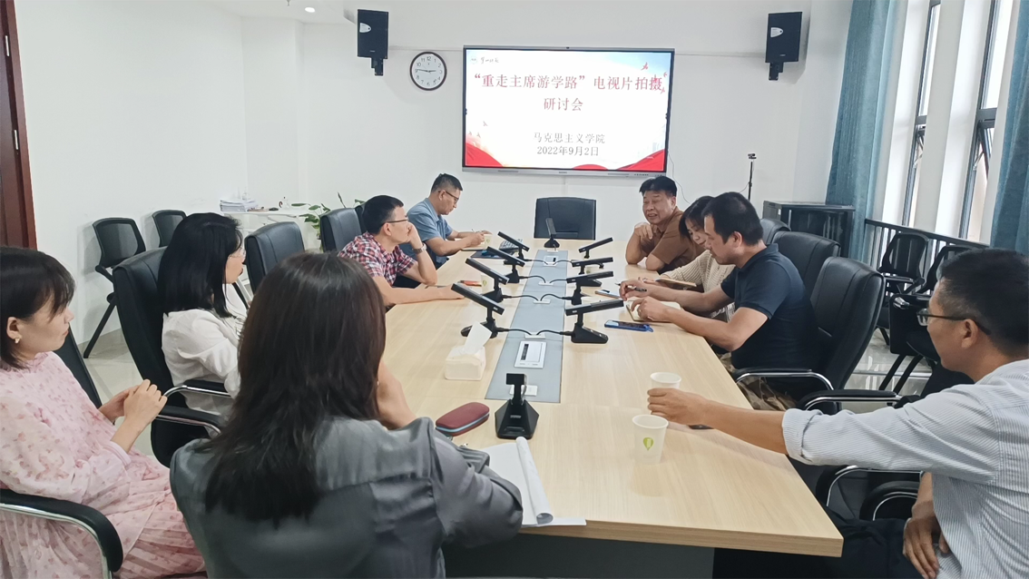 9月2日,太阳成集团tyc122cc邀请到湖南教育电视台编导来到马院,共同商讨“重走主席游学路”电视片的拍摄事宜。中南大学教授曾长秋、湖南教育电视台易仙、马公司党政领导班子陈明、阮东彪以及部分教师代表参加。