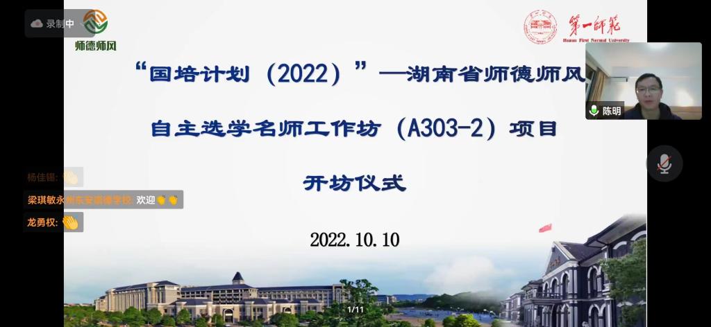 10月10日上午,由公司承办的“国培计划(2022)”——湖南省师德师风名师自主选学工作坊(A303-2)项目顺利开坊。工作坊坊主陈明经理,辅导员陈攀文、洪银香,管理员谢玮、龙淼以及来自湖南省14个市州的150位学员参加会议。会议由陈攀文主持。