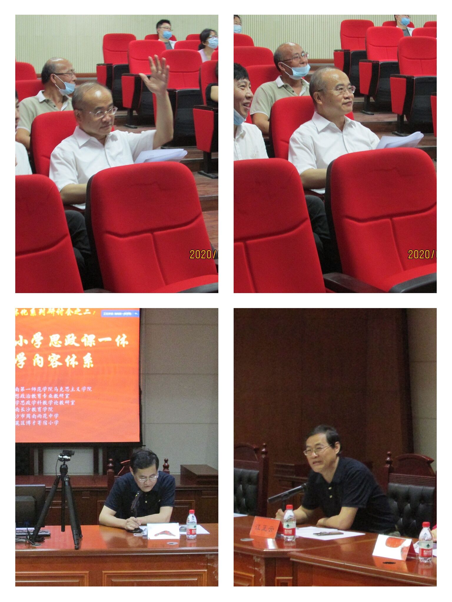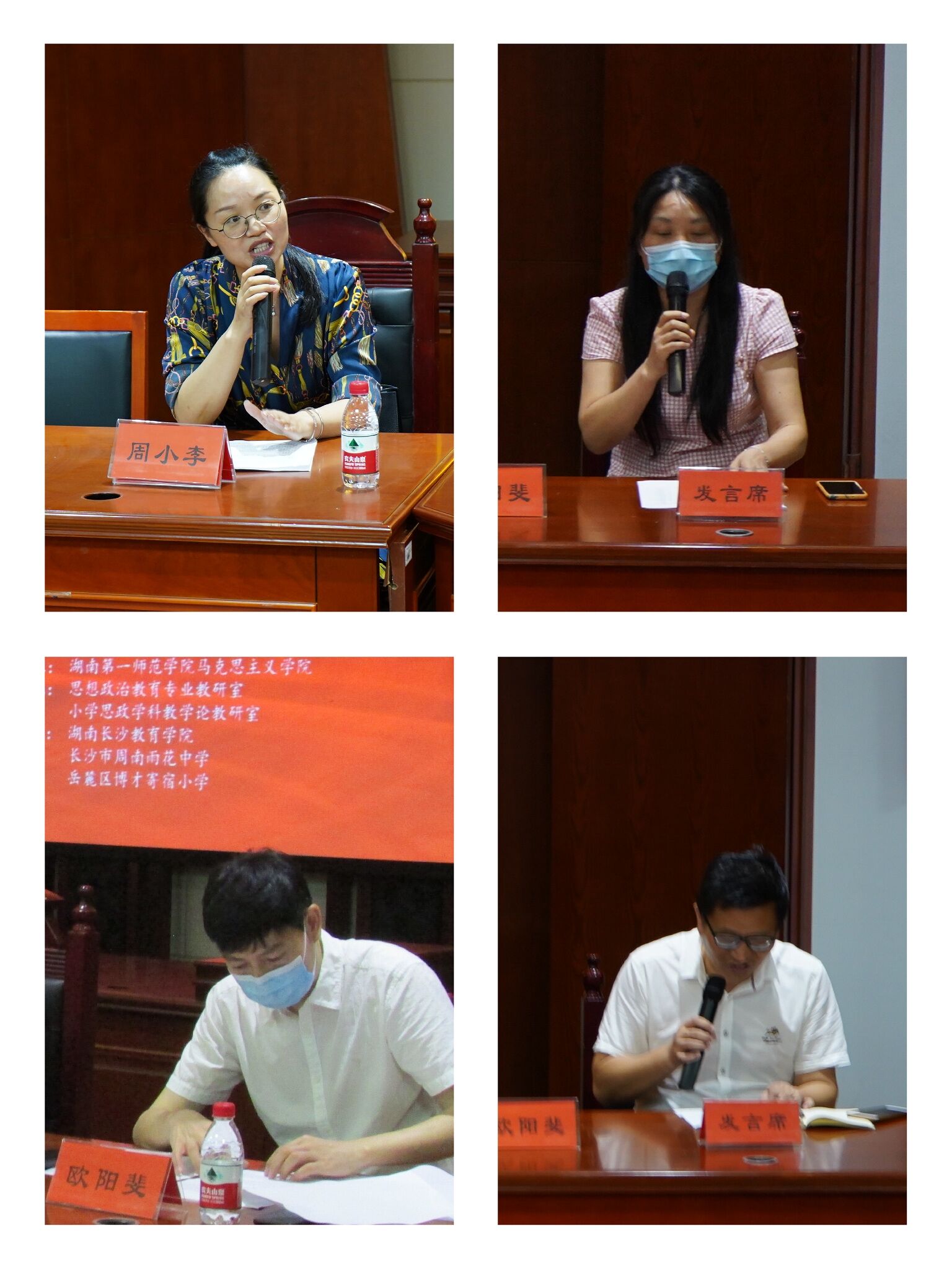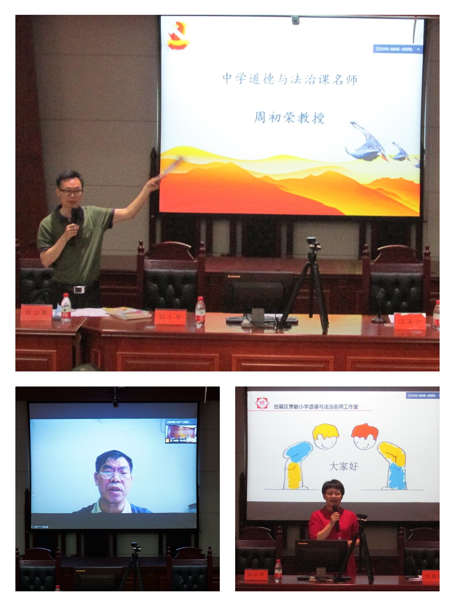 研讨会的三位特邀嘉宾作了精彩的演讲。博才寄宿小学黄敏老师从一条主线、六大生活领域、七大教育主题等方面介绍了小学道德与法治课程设计和教材编写的基本思路;周南雨花中学周初荣老师分析了初中学段道德与法治课程的主要教学内容、教学方法以及学情,强调指出了初中道德与法治教师应当具备的综合素养;长沙教育公司唐良平教授通过线上讲座方式深度解读了新课改对高中思想政治学科在课程板块、教学内容等方面所带来的一系列变化。