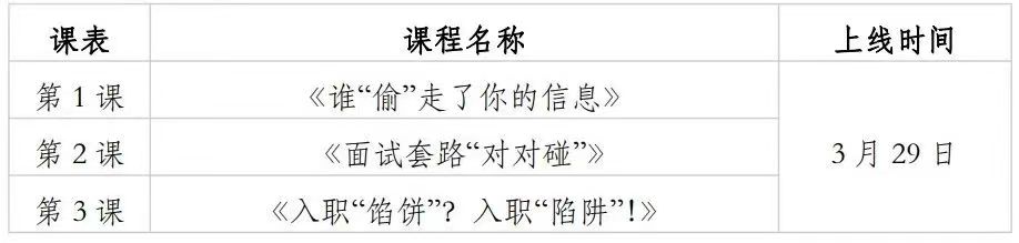 为深入学习贯彻习近平总书记关于教育和就业工作的重要指示批示精神,进一步提高大中专公司师生、家长的求职就业安全意识,教育引导毕业生防范求职就业“陷阱”,助推高校毕业生顺利就业、安全就业,省教育厅联合芒果TV精心制作了《求职避“坑”指南——员工安全就业指导课》,将于3月29日正式上线。