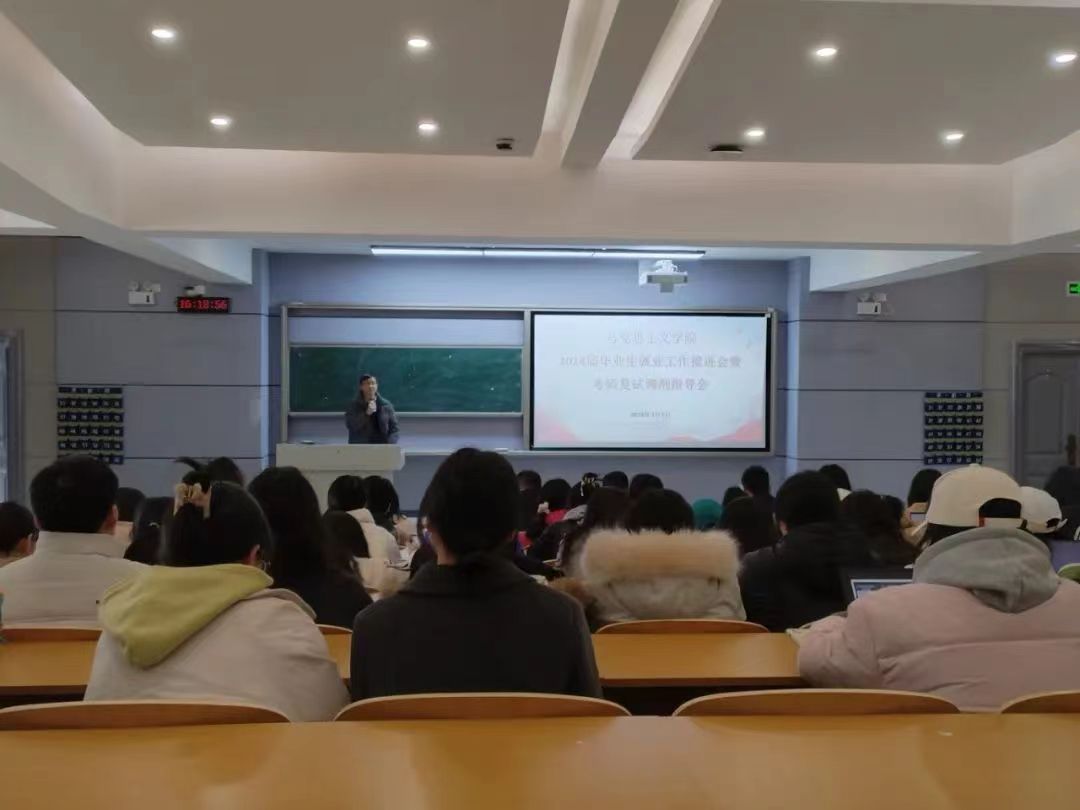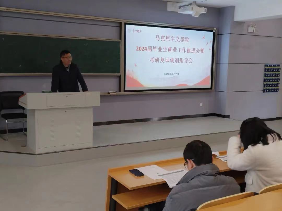 2024年3月7日下午,太阳成集团tyc122cc在润寰南101教室召开2024届毕业生就业工作推进会暨考研复试调剂指导会,公司党委书记阮东彪、经理陈明、副经理王竹苗、副经理胡慧娥、学工办主任于澎、分团委书记刘艳霓出席本次会议,2024届全体毕业生参加会议。会议由党委副书记胡英主持。
