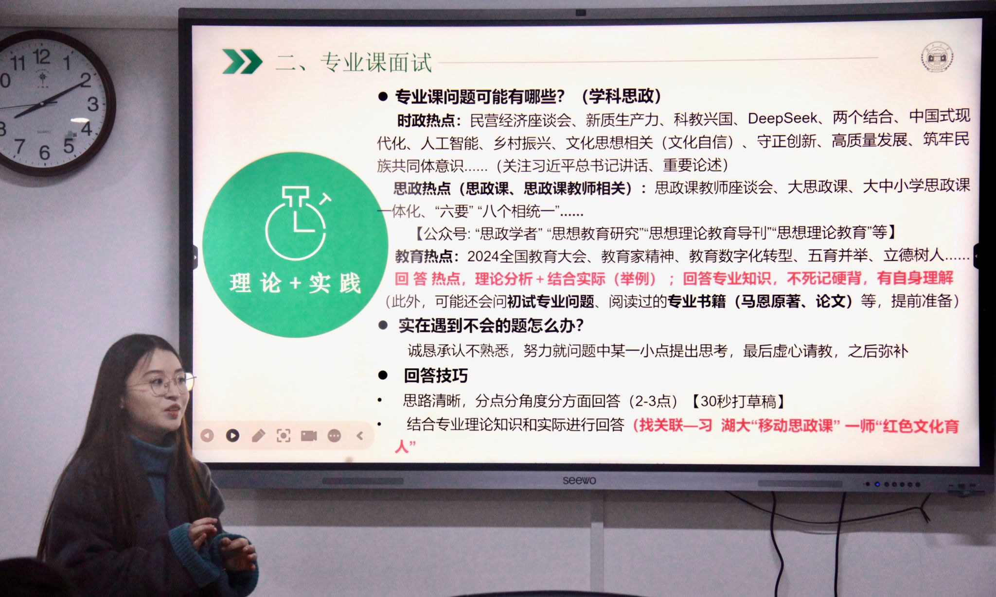 优秀学姐们的分享各有侧重又互为补充,从复试流程到备考细节,从笔试技巧到面试策略,为同学们搭建起系统全面的复试知识框架。来自华中师范大学的胡友唯学姐详细介绍了复试的流程、形式以及日程安排,她强调了综合面试环节的重要性,建议同学们提前预设和分析考官可能提出的问题,并采用总分总的逻辑结构来回答问题,要充分利用公司的红色特色为自己加分。湖南师范大学的肖银学姐就备考时间安排和笔试环节提供了详细的指导。她结合自己的备考经历,解答了同学们关于如何应对陌生专业课问题的疑问。湖南大学的金珊学姐则根据最新的复试要求,提醒同学们注意考核知识点,并就如何协调复试备考、教育实习和毕业论文给出了中肯的建议。湖南大学的蔡雯萱学姐从专业课笔试和面试两个方面进行了分享,强调了自我介绍、简历制作和英语测试的重要性,特别提醒同学们要注意仪容仪表。李文竞学姐和唐玉珺学姐是公司与湖南师大联合培养硕士研究生,她们围绕面试中的英语自我介绍、口语问答、专业问答三个环节进行了详细讲解。最后,福建师范大学的蒋泽南学姐从英语口语和履历奖项两个方面进行了分享,鼓励同学们挖掘自己的闪光点,展现出独特的竞争力。