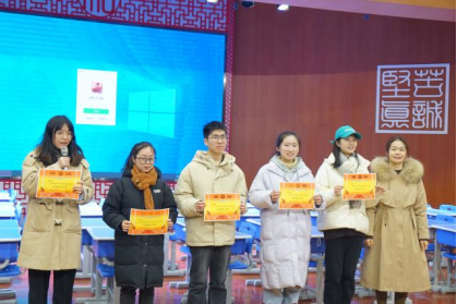 会议第三项,观看教育实习纪录片后,明德麓谷公司彭玉娜书记为优秀实习老师安美儒、曾佳、刘凌、欧阳琦、康子妍颁发荣誉证书。