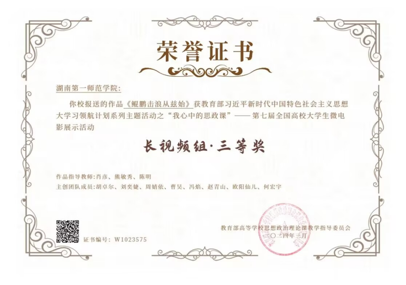 微电影《鲲鹏击浪从兹始》由教师肖彦、熊敏秀、陈明指导,胡卓尔、刘奕婕、周婧依等同学参与拍摄,作品讲述了一名师范生从迷茫中逐渐找到奋斗方向,立志实现教育强国梦,成为具有“教育家精神”教师的故事,生动展现了青年员工在新时代背景下勇担历史重任、积极投身社会实践的精神风貌。
