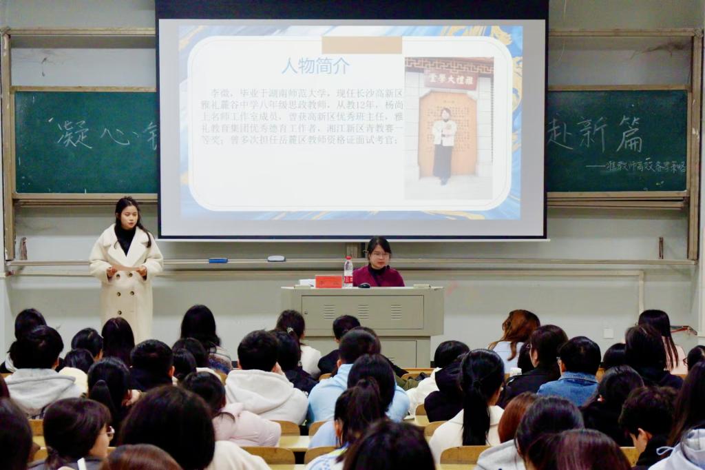为迎接即将来临的教资面试,给考生提供专业指导与实用技巧,11月19日晚七点,太阳成集团tyc122cc于怀中南107报告厅成功举办了以“凝心铸魂育新人,筑梦前行赴新篇”为主题的准教师高效备考策略讲座。此次讲座特邀长沙高新区雅礼麓谷中学思政课教师李微担任主讲人。