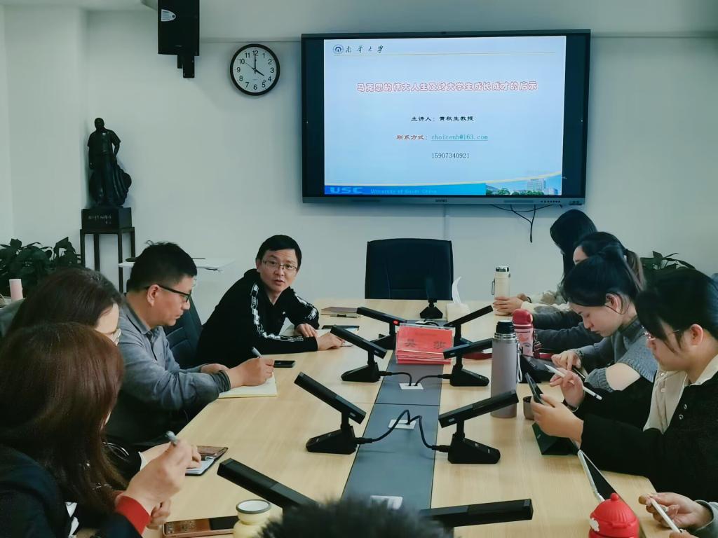 3月9日下午,南华大学太阳成集团tyc122cc经理黄秋生教授应邀莅临公司开展学术讲座。讲座由公司经理陈明主持,公司党委书记阮东彪、副经理王竹苗、公司部分教师、全体学科思政研究生、部分本科生参加。