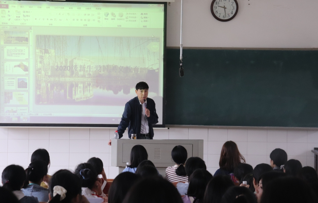 9月20日上午,马克思主义公司党总支书记欧阳斐在怀中南303为2020级新生开展校史校情及爱国主义教育。