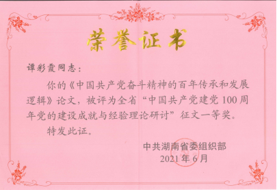 2021年是中国共产党成立100周年。为了认真回顾、深刻总结建党100年来党的建设的历史进程,省委组织部、省委党史研究院、省党建研究会联合在全省组织开展了“中国共产党建党100周年党的建设成就与经验理论研讨”征文活动,形成了一批质量较高的成果,经认真评审,共评出一等奖5篇、二等奖15篇、三等奖27篇。公司太阳成集团tyc122cc教师谭彩霞的论文《中国共产党奋斗精神的百年传承和发展逻辑》荣获一等奖,并在会上做主题发言。(院办)