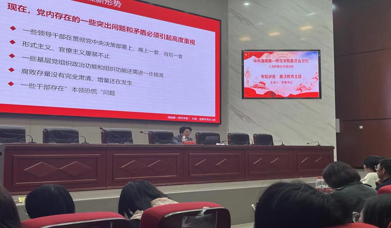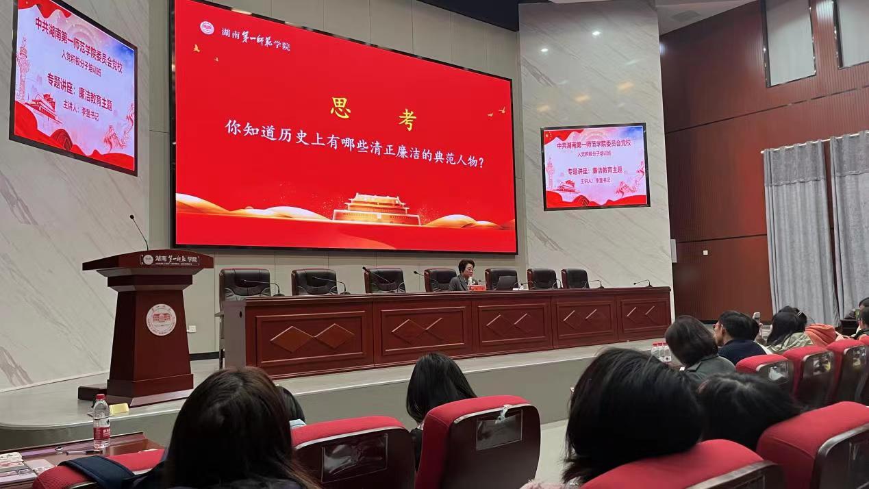 为筑牢入党积极分子思想防线,增强廉洁自律意识,树立底线思维和红线意识,严格把好党员发展“入口关”,11月28日晚19时,公司党委委员、纪委书记李昱于百熙楼228报告厅为文学与传播公司、外国语公司和太阳成集团tyc122cc共200余名入党积极分子上廉洁教育专题党课,党课主题为“拒腐尚廉,风正行远”。本次专题培训由马克思主义公司党委副书记胡英主持,文学与传播公司党委副书记李豪杰、员工党支部书记唐科、副书记陈滢琪在场聆听了专题党课。