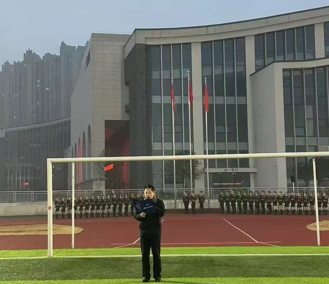 晨光熹微,寒风凛冽,全体师生整齐列队,神情庄重肃穆。国旗护卫队迈着整齐划一、铿锵有力的步伐,护卫着五星红旗,昂首阔步迈向升旗台。激昂的《义勇军进行曲》奏响,鲜艳的五星红旗在风中冉冉升起。全体师生庄严肃立,齐声高唱国歌,目光紧紧追随着国旗,以最诚挚的敬意,向伟大祖国致以崇高礼赞。