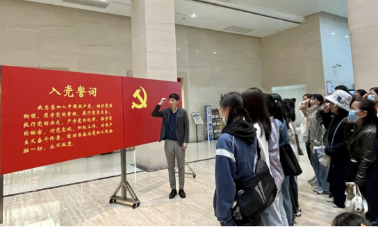 在湖南党史陈列馆大厅,党总支书记欧阳斐带领全体党员整齐列队,面向鲜红的党旗,举起右拳,重温入党誓词,再一次谨记作为共产党员的初心与使命。