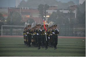 7时,全院师生神情庄重肃穆,国旗护卫队迈着铿锵有力的步伐护送鲜艳的五星红旗来到升旗台前。7时05分,伴随着庄严的《义勇军进行曲》,五星红旗冉冉升起,迎风飘扬,全体师生齐唱国歌,行注目礼。