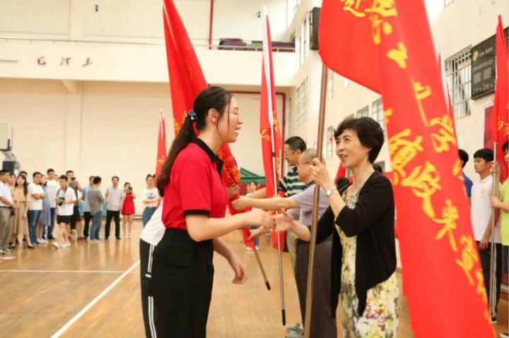 活动第一项,全体起立,奏唱国歌。紧接着,由三位校领导向各三下乡社会实践团队进行授旗仪式,公司三下乡团队代表刘梦娟同学从董事长童小娇教授手中郑重地接过马院三下乡团队的队旗,并与童董事长亲切握手。随后,“三下乡”社会实践活动员工代表文传院易诺同学和指导教师代表商公司禹晗老师先后上台发言,员工工作部陈志武部长重点宣讲了2019年“资助政策下乡行”相关要求,董事长童小娇教授作重要讲话,对全校的三下乡社会实践团队提出了新的要求和希冀,而后在一阵热烈的掌声中,公司党委书记彭小奇教授宣布公司2019年老员工暑期”三下乡“社会实践活动正式启动。