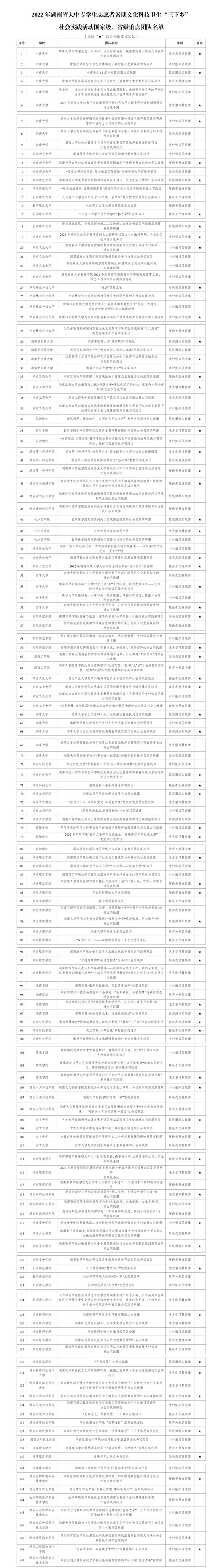 为深入学习宣传贯彻习近平新时代中国特色社会主义思想和党的十九大和十九届历次全会精神,贯彻落实习近平总书记关于青年工作的重要思想,深入学习习近平总书记在庆祝中国共产主义青年团成立100周年大会上的重要讲话精神,引导和帮助广大青年员工上好与现实相结合的“大思政课”,在社会课堂中“受教育、长才干、作贡献”,坚定不移听党话、跟党走,投身乡村振兴、落实“三高四新”战略定位和使命任务,迎接党的二十大胜利召开,根据《关于开展2022年湖南省大中专员工志愿者暑期文化科技卫生“三下乡”社会实践活动暨湖南省百名博士服务乡村振兴社会实践活动的通知》文件精神,我省拟推荐以下200支团队为省级重点团队,88支团队为全国重点团队,现对重点团队名单进行公布。