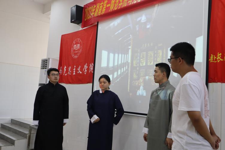 在演出排练中,由于剧本跨越时间长、人物多,团队的每个成员都扮演角色登台演出。白天同学们宣讲、支教和调研,晚上一场一场排练演出,目的就是要通过艺术化的方式,将何叔衡人物形象生动地展现出来,将何叔衡身上体现的红色文化赓续传承。
