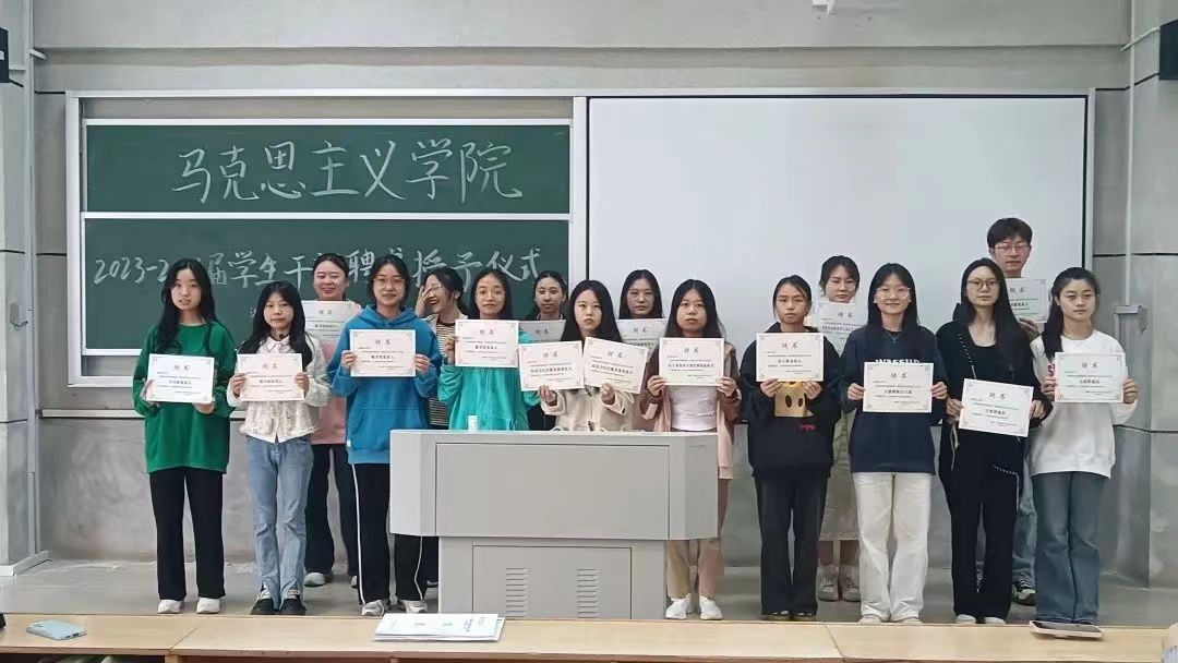 接着,受聘仪式正式开始,由杨荣为新一届员工干部颁发聘书,同学们按照党支部、分团委、员工会的顺序依次上台接受聘书,并合影留念。