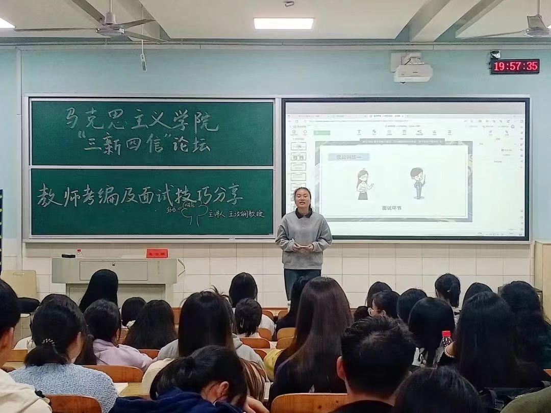 11月22日晚,公司在怀中南102教室顺利举行了“三新四信”论坛讲座。此次讲座以“凝心铸魂育新人 筑梦前行赴新篇”为主题,由王汝娴老师主讲,主要分享教师考编及面试等各方面经验。公司21级、22级思想政治教育专业员工在场聆听了此次讲座。