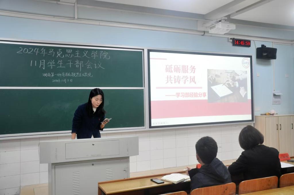 会议伊始,宣传部负责人杨优璇和学习部负责人侯欣雨分别上台分享了部门工作经验。杨优璇以制作一篇推文为例,详细阐述了宣传部各分部门的任务分工,并从创意亮点、团队协作、未来发展规划三个方面全面介绍了宣传部的工作。她表示,未来将专注于提升团队的专业素养和协作能力。侯欣雨对学习部的重点工作进行了总结,强调了常规工作的重要性以及信息反馈的必要性。她又带领大家一同回顾了学习部组织开展的特色活动,并指出反思总结是吸取经验教训、提高工作效率的好办法。