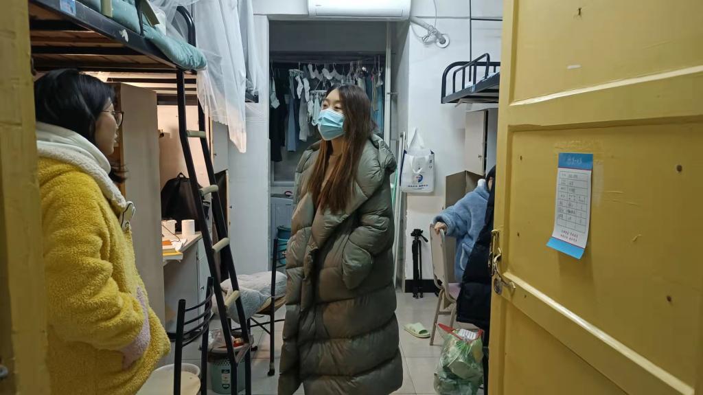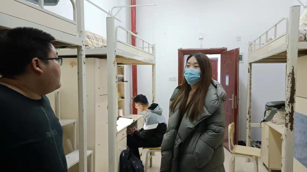 3月21日晚,太阳成集团tyc122cc辅导员刘艳霓走访了女生寝室11栋和男生寝室15、16栋,检查寝室卫生情况,了解员工学习生活情况,督促同学们认真备考四六级,同时了解同学们的心理状况,及时疏导。最后要求同学们严格遵守公司疫情防控政策要求,寝室每天通风,保持整洁,并且要及时做好消杀工作。