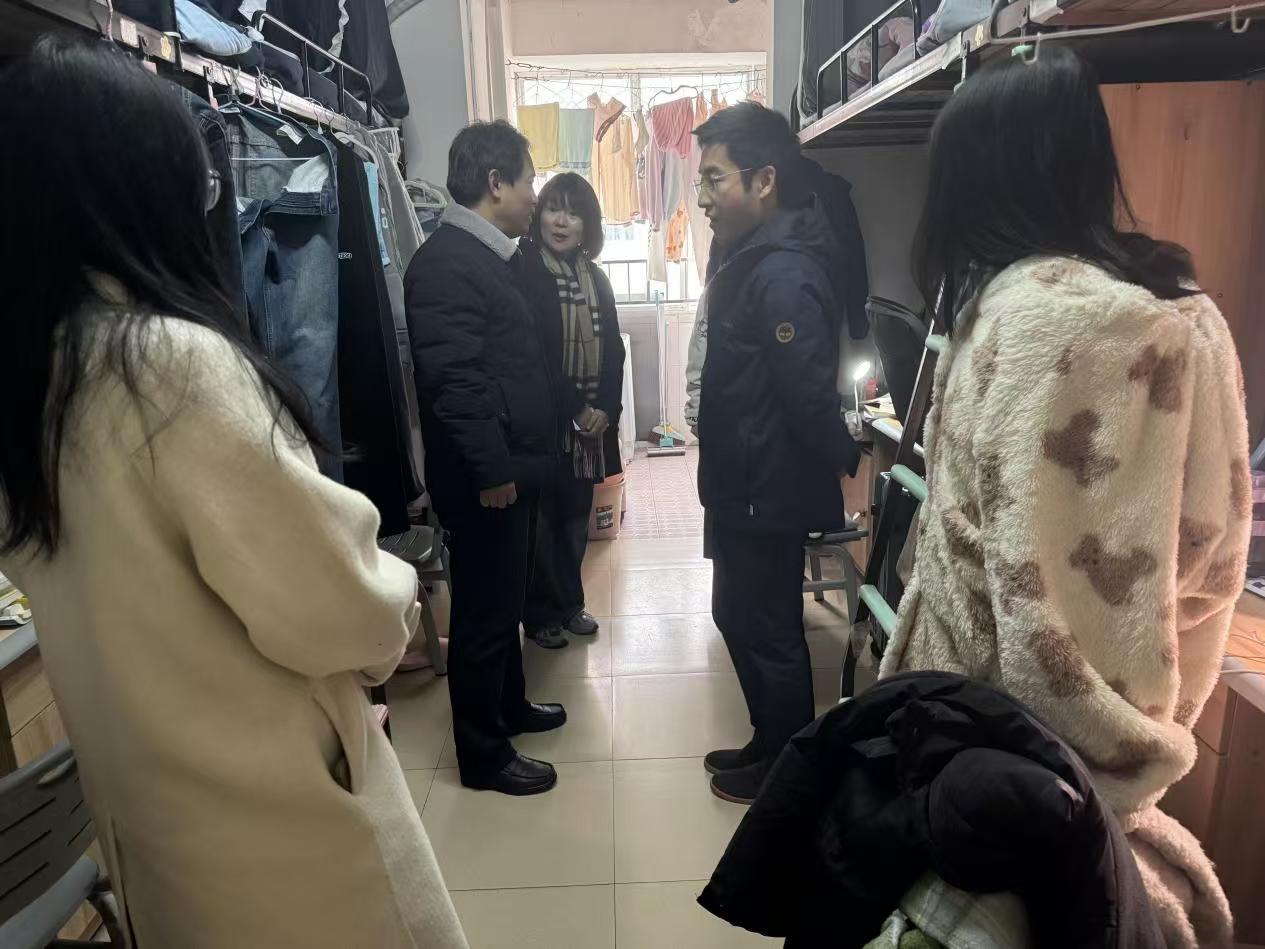 12月27日下午,马克思主义公司党委书记曾玉华、党委副书记胡英带领辅导员深入员工寝室,叮嘱同学们期末合理安排复习时间,同时也耐心提醒同学们,冬季要注意防寒保暖,要提高宿舍安全意识。严禁使用违规电器、大功率电器等,告知同学们未使用的插座等电器设备要及时断电。即查即改,避免事故发生,共同维护宿舍的安全与稳定。
