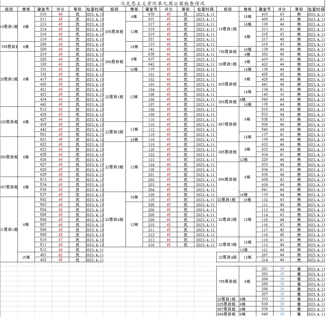 总结:本周宿舍卫生大检情况较上周差,差寝数量增加,如795思政班6-201(黄毅敏、唐子婕、李嘉慧、李效阳)与203(丑心仪、童昕阳、谭子涵、易正萍)、20思政1班6-333黎晓衫、宁慧娟、钟丹、刘凌)、825思政班与857思政班6-539(粟向裕、唐小蕾、李菁、吴牧宁)、896思政班6-640(蒋京素、姚瑶、胡君忆、龙嘉和)等宿舍需要继续改进!希望各班加强宿舍卫生管理!