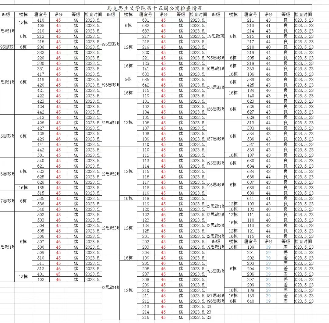 宿舍既是同学们生活,学习,休息的地方,又是员工交流思想,培养综合素质的重要活动场所。为了同学们有个良好的宿舍环境,公司认真严抓的,在此希望每位同学都能认真打扫好寝室卫生,以下就是第十五周公寓检查基本情况: