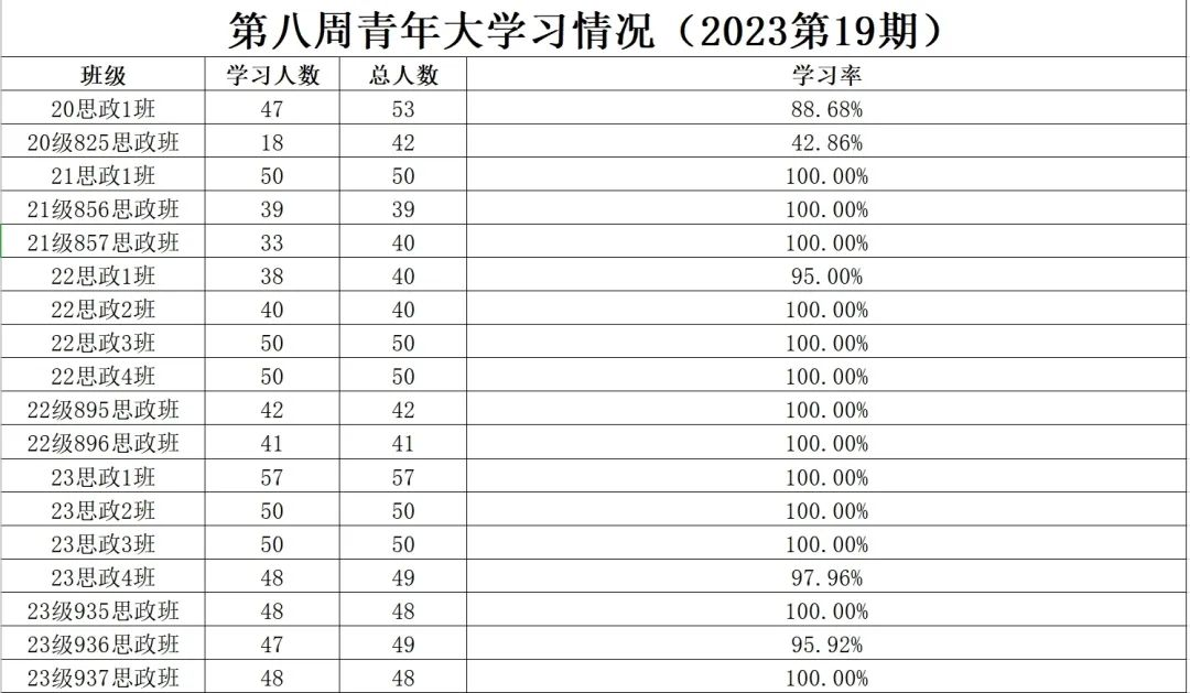 总结: 在本次青年大学习,21级思政1班,21级856思政班,22思政2班,22思政3班,22思政4班,22级895思政班,22级896思政班,23思政2班,23思政3班,23级935思政班,23级937班学习率达到了100%,在这里提出表扬;