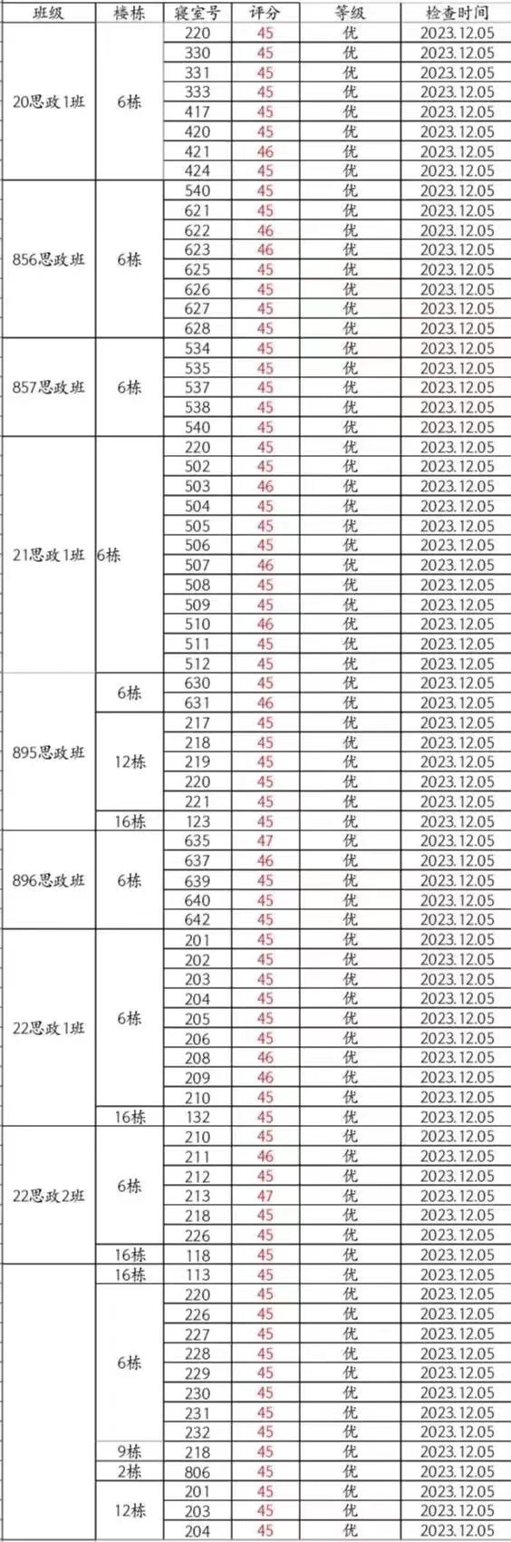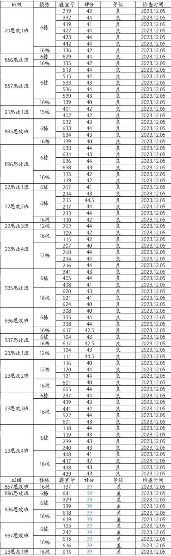 本周大检情况良好,但差寝数量较上周有所增加。其中857思政班16-137(丁嘉豪、周靖浩、符灿宇、田畅轩)、896思政班6-641(芦艺丹、陈萝玥、谭佳、雷奕林)、936思政班的6-329(陶淑颖、邝映羲)、6-339(何琳、孙诗琴、曹燕萍、龚紫鑫)与16-618(杨恩旭、刘锦洋、张汗泽、傅灏文)、937思政班6-105(姜添娇、刘媛、刘思思、杜佳仪)与16-616(张祺、余志纬、李鑫益、何佳旭)、23思政1班16-615(杨程、李书畅、陈国颖、全启航)等宿舍仍需继续努力。希望大家共同努力,建设文明美丽公寓!