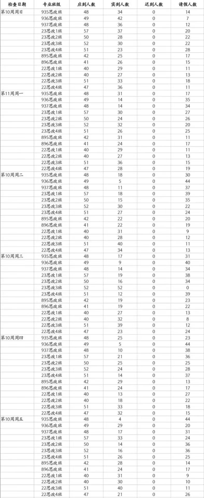 马院第十一周查堂情况