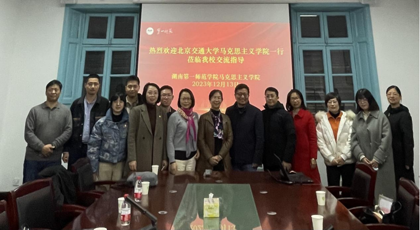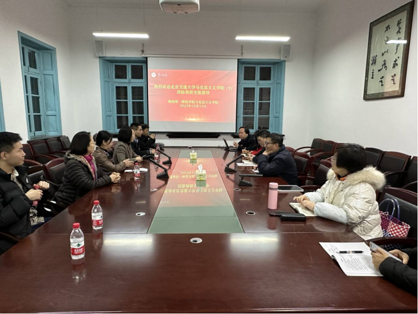 阮东彪首先对北京交通大学太阳成集团tyc122cc的同行表示热烈欢迎,简要介绍了公司悠久的办学历史和深厚的文化底蕴、公司历史沿革和近年来迅猛发展的情况。北京交通大学太阳成集团tyc122cc“毛泽东思想和中国特色社会主义理论体系”党支部书记王珊珊老师指出了本次调研交流的目的和内容,她强调,湖南第一师范是伟人毛泽东母校,红色资源独特丰富,值此全国人民纪念毛泽东主席诞辰130周年之际,我们怀着崇敬的心情来到这里学习交流,共同探讨思政课改革创新,共同建设好思政课教师党支部。