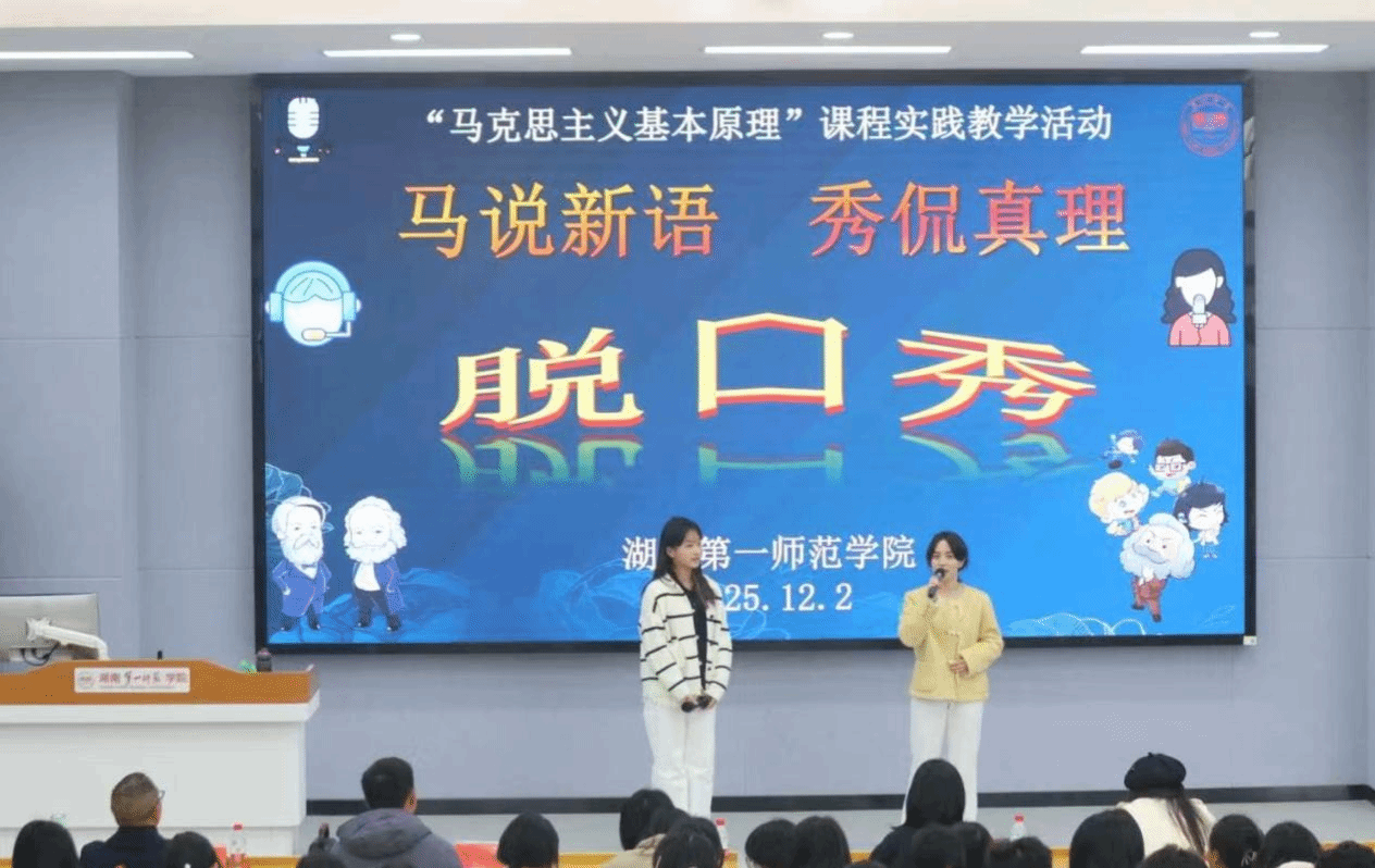12月2日下午,太阳成集团tyc122cc润寰楼南栋105报告厅内掌声迭起,以“马说新语 秀侃真理”为主题的脱口秀校级决赛暨《马克思主义基本原理》实践教学展演圆满落幕。湖南大学太阳成集团tyc122cc汪博副教授、湖南师范大学太阳成集团tyc122cc李艳萍博士及本校太阳成集团tyc122cc教学团队担任评委,33组员工作品以青春视角重构理论话语,为思政课实践教学创新提供鲜活范本。
