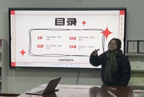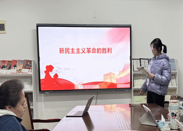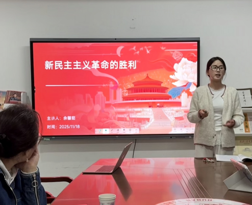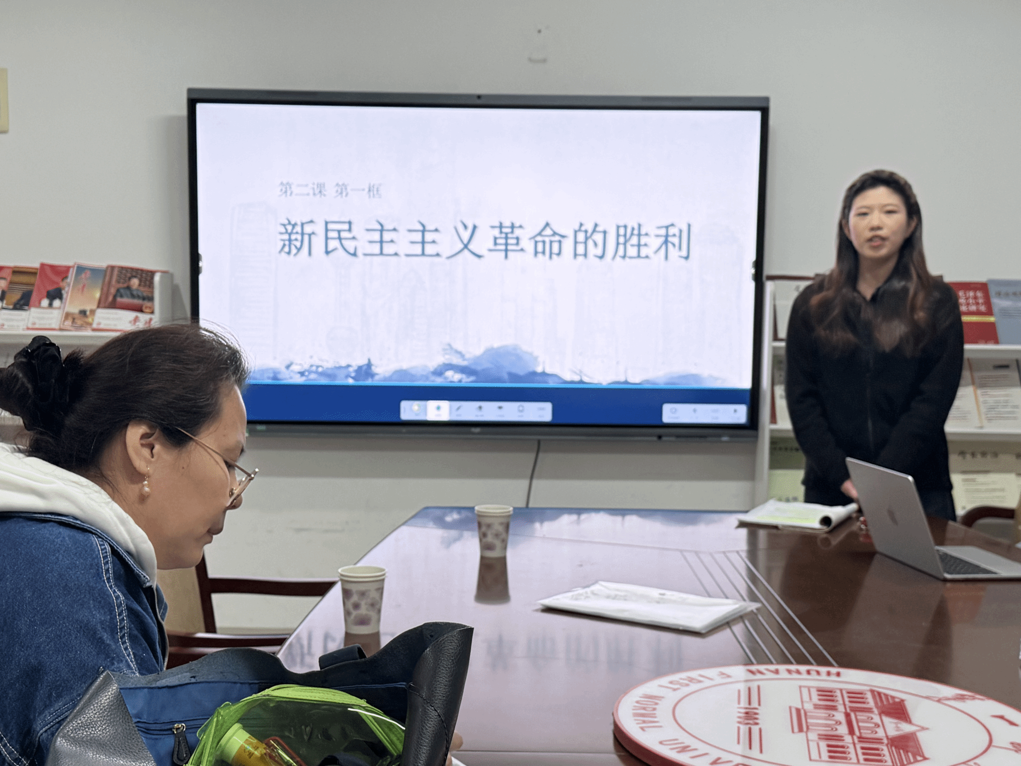活动中,伍蓉、盘龙婧等研究生登台开展 “新民主主义革命的胜利” 主题微课展示,围绕胜利原因、历史意义等核心知识点梳理教学框架,阐述导入设计、重难点解析及红色案例运用思路,展现了对高中思政课堂的务实探索与充分准备。匡艳、陈攀文老师肯定同学们紧扣课标、案例贴合主题的亮点,针对教材不熟、内容冗余、导入生硬、思政属性不突出等共性问题精准指导,建议深耕教材聚焦核心要点,结合地方红色资源与时政热点创新教学形式,强化语言表达与课堂驾驭能力。